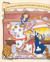 As one who enjoys innovation and creative thinking, I find the approach David LaRochelle and Richard Egielski have taken to the new Arthur A. Levine Books publication, The End, is a delight. Egielski’s artwork is framed in decorative borders, and the text was hand-lettered by Georgia Deaver. These features and the scrolls for the text suggest the stately elegance of a traditional fairy tale. As we might expect from a traditional fairy tale, we are told that the story’s heroes, the brave knight and the quick-thinking princess, do live happily ever after. This book should not, however, be dismissed as just another predictable fairy tale. The wedding couple have a wild assortment of well-wishers there to celebrate the nuptials. Perhaps someone once told the illustrator that he would get a book such as this one published “when pigs fly.” Whatever the reason, the frolicking journey through this colourful fantasy land even includes several glimpses of a flying blue pig. There are also giants, a ticklish green dragon, one hundred bunny rabbits and other assorted creatures large and small to entertain readers.