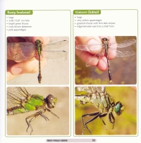 On the book’s penultimate page, there a briefly annotated bibliography, “Books About Caterpillars”, that lists three field guides to caterpillars and a book of fiction. An index completes the work. Dragonflies, nature’s “helicopters” which dart about, are also something that most of us have observed. Unlike butterflies and moths whose colours indicate that they are different species, to the untrained eye, most dragonflies look very similar, and their differences in size we might erroneously attribute to stages of maturation. Earley begins Dragonflies: Catching, Identifying, How and Where They Live by distinguishing between dragonflies and their closest relative, damselflies. The latter are a lot skinnier and smaller than most dragonflies. As well, “dragonflies hold their wings out beside their body, while damselflies hold their wings together and above their body.” Despite their resemblance, Earley makes it clear that “we will concentrate on dragonflies in this book.” As in the caterpillar book, Early also presents this insect’s life cycle which consists of three stages: egg, nymph and adult. While Caterpillars discussed catching and “raising” caterpillars, the dragonfly is the adult stage, and, consequently, Earley describes a catch and release approach. A pair of facing pages are given over to describing six common dragonfly families: Darners, Clubtails, Spiketails, Cruisers, Emeralds and Skimmers. “These are the kinds of dragonflies that you are most likely to find in North America.” Seventeen pages then constitute a “Mini Field Guide” that features a single Spiketail, eight Darners, four Clubtails, four Emeralds, 16 Skimmers and a single Cruiser. Each entry provides two photos of the dragonfly, with one being a “portrait” of the dragonfly while the second one usually focuses on some distinguishing feature of that particular dragonfly. The brief text accompanying each dragonfly simply provides identifying characteristics. For example, that accompanying the Swamp Darner says: