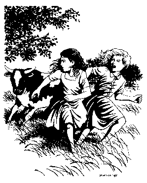 Thora decided that she would have to tie the cow's tail. She took a rope from the wall and tied it to a nail directly behind the cow, then fastened the other end to the cow's tail, which now stood out like a horizontal ramrod behind the cow. This time, when she resumed the milking, not one drop came, and the cow stood defiant and still. Then she heard Hannes' belligerent voice behind her saying accusingly, "Cows hold back their milk when provoked. Your awkwardness is the cause of the problem."