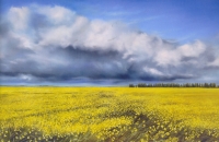 Richard Cole’s illustrations, which are mostly oil paintings, have a dreamlike quality but also depth. They are multifaceted and encourage reflection. A motif that carries throughout the book is the boy’s figure. Brushes in hand, he is present in almost every spread. As readers look carefully at the text collage that makes up the boy’s figure, they will notice that it features dictionary definitions relating to the content of the whole illustration; for example, as the boy visually translates the “blue of a sputtering boom lift” (p. 34), his figure features definitions of Prussian blue and cobalt blue. Compositionally, it helps his figure to stand out from the painterly background. It also creates an emotional effect: when readers notice this subtle artistic choice, they are able to experience the same process of discovery and reward as the boy in the story. The strength of the visual storytelling, however, draws attention to the text. The prose is somewhat disjunctive, and a clear vision of the target readers is missing. The text fluctuates between repetitive writing suitable for beginning readers, “He paints them tall. He paints them small” (p. 11), and more sophisticated thoughts, such as “A row of orange hazard cones becomes… the deep horizon of a prairie field” (pp. 42-43). The more advanced descriptions, however, do not match up with a more advanced reader’s meaning-making abilities. In drawing such clear-cut connections between the coloured objects and the landscape paintings, the text undermines the self-discovery and empowerment that is at the heart of the story. Rather than allowing readers to create those connections themselves, they are led to them. Despite this, it is important to note that in these colour sections Watt’s lyrical prose pairs well with the paintings and may inspire young artists to look at the world around them through a different lens. In other spreads, however, the text and illustrations tediously communicate identical, straightforward messages that can be frustrating for younger readers: an illustration of the boy hanging a homemade sign on his door is paired with the text, “He makes a sign for his bedroom door: Art Studio” (p. 7-8). This linear connection flattens the story by preventing readers from looking beneath the surface into the boy’s identity-making as an artist. There is no space for the reader to ponder why the boy made the decision to call himself an artist. While writers are often given the advice to “show, don’t tell,” this particular spread both shows and tells, and in doing so, underestimates the agency of readers to engage with the story and create deeper meaning. Later in the book, the narrator outright states, “I’ll tell you what happens next. It’s simple” (p. 23). While this sort of conversational tone may work in an oral storytelling context, it is almost overly casual and improvised in printed form especially when followed by more literary-style descriptions of canola fields and mountain lakes. The story is supplemented by two information pages at the end of the book: a basic description of colour theory and origins of paint, and a passage on the creative process behind The Boy Who Paints. This additional information is not usually included with Despite these issues, The Boy Who Paints is still a valuable addition to a library due to its appeal to young artistically-minded readers. Learning activities could easily be derived from the story and illustrations. It encourages readers to consider possibilities beyond what they can imagine. Readers in western Canada may also enjoy the local nature of the landscape, and it may act as a point of connection to the story. The Boy Who Paints is a positive, inspiring story with wonderful illustrations. Recommended. Sabrina Wong is a librarian at the University of Calgary in Calgary, AB.