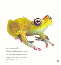 Of course, the bold, eye-catching photos will make this book attractive for casual, fun viewing and sharing. Could that Shoebill on page 22 be another Muppet character? Is the Tawny Frogmouth on page 53 really a bird, or a featherless frog? The concise details in language that will be easily accessible to all focus on specific features (“the Vietnamese Mossy Frog just stops moving — and disappears”) and may pique curiosity to learn more. In the Introduction, the author confesses a personal fascination for frogs since childhood and makes the point that “the more you know about the natural world…the better you will understand…how our actions affect everything else that shares this world with us.” With that in mind, who can resist the appeal of even a homely creature like the Mexican Burrowing Frog, for instance, that spends nearly all of its time underground?