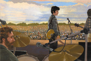 While Mr. Robertson the younger does the narrative of his father justice, there are times when the paragraphs threaten to overwhelm the images. The text, well-written as it is, feels like part of a work for older children while the images appeal to a broader variety of ages. Perhaps that was Robertson's intention, but it may limit the book's appeal to younger readers. If one question has bedevilled those who try to chronicle The Band, it has been "who is at the centre of the story"? For Martin Scorsese, Sebastian Robertson and many a rock critic, the answer has been that Robbie Robertson was the linchpin of The Band. This cuts against the original narrative of The Band as a singular organic unit who sang, played and wrote as an ensemble. The book struggles with this issue, but, being as it is titled "Robbie Robertson's Story", not "The Band's Story", it's no surprise that the final image is of Robertson standing at centre stage while what readers can make out of his Band-mates are relegated to the edges of the image. Perhaps the story of The Band is too big for one small book; after all, Robertson needs a lot of text to do justice to just one Band member. Perhaps readers can look forward to books for a younger audience that so successfully tell the stories of Levon Helm, Richard Manuel, Garth Hudson and Rick Danko in the future. While such a beautiful book on such an important subject would certainly be a welcome addition to any classroom or library, the ideal audience for this is children old enough to read longer paragraphs but not embarrassed to be seen reading what looks like a picture book. Recommended. Jeff Nielsen teaches high school English in Ste. Anne, MN, and had been known to claim that "music ruined my life".