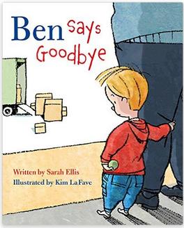 Sarah Ellis revives the relatable character of preschool-aged Ben in her new book, Ben Says Goodbye. In this story, Ben’s best friend Peter is moving away, and Ben is very sad. Ben and Peter watch as the moving truck is packed up, and Ben’s family tries to help ease the transition by suggesting that Peter can visit or that the friends can talk online. Finally it is time for Ben to say goodbye, but he doesn’t want to. Instead, Ben decides that he is going to move too – not to some faraway place, but underneath the kitchen table into his “cave”. Cave Ben protects himself with a club (flashlight) and pointed stick (pencil), and tames a lion (stuffed) as his only friend. He ‘finds’ food (left outside the cave) and only speaks in grunts. After a while, Ben begins to draw on the walls of his cave. He draws copious stories of two best friends who have many happy adventures. Then he draws a story of two friends who live far apart and tunnel to the center of the earth to have a barbeque. This story projection seems to help Ben come to terms with the loss of his friend, and, at the inviting smell of popcorn and view of a fire in the fireplace, Ben finally crawls out of his cave to join his family. Ben hears a loud honk while snuggling with his family in front of the fire and watches curiously as movers unload box after box of stuff and then eventually a new blue scooter. He comes full circle in his emotional journey and begins to wonder if maybe the scooter is the exact right size to fit a new friend. Losing a friend to a move is a familiar experience for children and adults alike, and this story will resonate with readers. Readers will relate to Ben’s unwillingness to say goodbye and his inclination to hide away and remember the fun times he and Peter had together. However, after being given some time and space to process his complicated emotions, Ben emerges ready to connect with his supportive family and consider the possibility of new friendships. The text of the story is accessible and simple. The only term that might trip up a reader is a few references to a game called ‘sniggle-ball’. This may or may not be a made-up game, but children may ask about it as it will likely be unfamiliar. The text also accurately captures the thoughts and feelings of a young child dealing with a sad life change. The illustrations by Kim LaFave in this story appear to be a combination of drawn and computer-generated, and they strongly support the text They are colourful and engaging, and the facial expressions on the characters are expressive. They also add depth and undertone to the text that is not there without them. For example, when the text describes Ben retreating under the table, he is said to have a club, a pointed stick, and a tame lion. Readers will see though through the illustrations that these are really a flashlight, a pencil, and a stuffed lion. The cave drawings that Ben appears to draw are also excellent, depicting a world of fancy and imagination perfect for a creative child. The entire feel of the pages with his drawings is completely different from the feel of the illustrations in the rest of the book, which serves the story well. It is also an interesting device to watch the progression of Ben’s stuffed lion in the book go from neglected toy to his only friend to security blanket. Due to the nearly universal experience depicted of losing someone you care about to moving away, Ben Says Goodbye is a story that many readers will relate to. Equally important though is the quiet message to readers that you can remember a friend while still participating in your life and looking forward to making new friends and memories. Ben Says Goodbye would be a good purchase for public libraries and school libraries that serve children in the preschool/kindergarten age group. Highly Recommended. Carla Epp is a hospital librarian with the University of Manitoba in Winnipeg, MB.