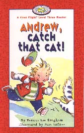 This large print short chapter book speeds along at a good pace through the episodic plot. Readers will laugh at the antics of Andrew and his friends as they dash from one false sighting of Sarah to the next, leaving disaster in their wake. The chase comes to an abrupt halt as numerous cats charge through the open door of a house. However, we are not shown the results of this intrusion, leaving the plot with an unsatisfying loose end: "She opened the door and in raced Rex followed by all the neighborhood cats. Then it started to rain." Another part of the plot is underdeveloped (Josh asks for Andrew's help to think of a way to earn money for his mother's birthday gift), and one wonders if it is needed at all. Once mentioned in Chapter 2, this complication isn't referred to again until Chapter 7. This final chapter seems to have been tacked on at the end to accommodate the earlier subplot. The story effectively ends in Chapter 6, with the discovery of Sarah under the table and with Andrew's concluding statement: "Well, Dad...she is an indoor cat." For a book directed at newly independent readers, I found the use of multiple viewpoints distracting. The story opens from Sarah's outlook, but switches to each new character as s/he enters the plot. Also, though it is categorized as a "Level Three First Flight" reader by the publisher, (for grades 2-4) the minimally challenging vocabulary, repetition, short sentences and generously illustrated chapters are more typically suited to the previous level in this series (grades 1-3). Recommended. Gillian Richardson, who lives in BC, is a former teacher-librarian and a published children's writer of fiction and nonfiction.