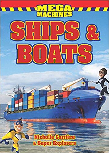The Super Explorers are caped superheroes who teach young readers about mega machines such as planes and ships and boats. They appear on every page, narrating facts about the machines and naming parts and describing what the machines can do. After a general definition of the plane and a ship and a boat, the two-page sections in each book get more specific in detailing different kinds of machines. In Ships & Boats, there are pages about small boats, like dinghies and rowboats, and large boats such as ferries and bulk carriers. In Planes, there is information about shuttle carrier aircraft, stealth aircraft, and bi-planes and tri-planes. Every page of both books contains colour, glossy photographs of the machines. The names of the machines appear in red lettering, and additional facts about the boats, ships, and planes appear in sidebars.